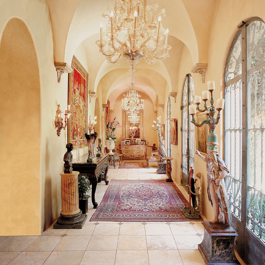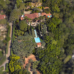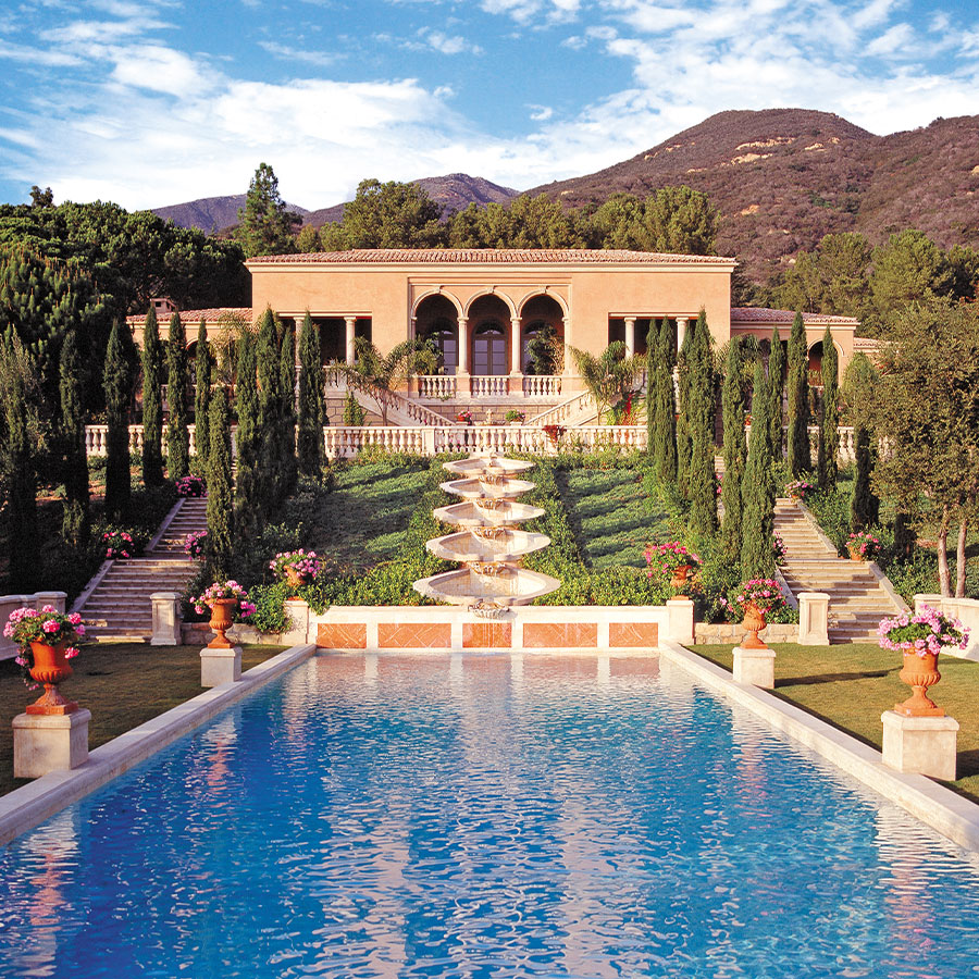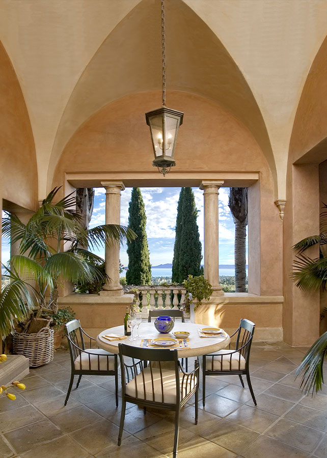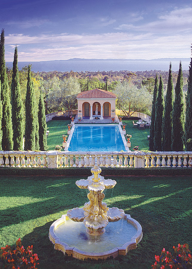 Paradiso, being the third and concluding part of Dante’s Divine Comedy, depicts heaven, through which he is guided by Beatrice. Il Paradiso creates its own piece of heaven. The authenticity of scale, proportion and detail is apparent upon entering the grounds through iron gates. Up a stone paved drive through oak and olive groves to the large Motor Court, carved out of the steep hillside, the large water feature reflecting off the glass and iron entry doors invite you in to stay. Inside vaulted ceilings with Venetian chandeliers, stone floors inlaid with terra-cotta keys, stone mantels, Tuscan columns and skylights festooned in silk evoke the splendid detail of Renaissance Italy. The Master Suite, through a separate sitting room/Library, features a marble-and-gold bath with a sunken spa tub with a view to a secret walled garden. Each of the main rooms flow through French doors to the grand central Loggia with views out to elaborate Gardens below and ocean beyond. The Villa was designed to look and feel as though it reigned supreme for generations of fortunate owners.