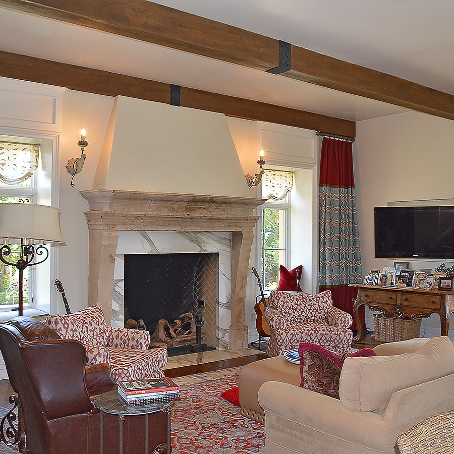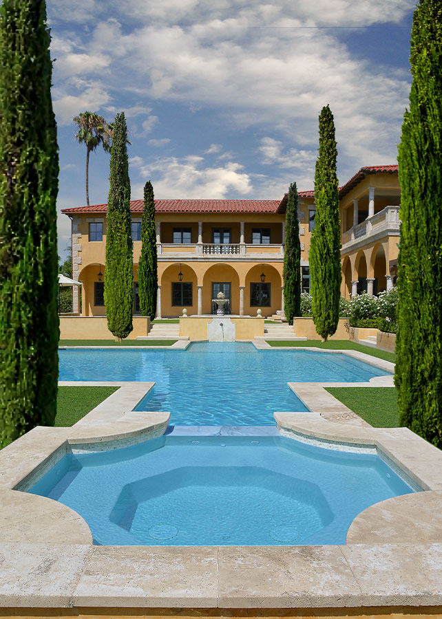 With its carved stone columns, lintels, balustrades, against the rich ochre colored plaster facade and red terra cotta roof tiles throughout the Villa, the authenticity of the design and detailing is apparent and you are greeted with an old world Tuscan Villa. Having been invited in through a stone columned arched portico to the front entry door of Mahogany, glass, and iron. Once inside one is connect to the 3 main formal interior, and 1 formal exterior spaces: The formal Entry/Stair Hall, with stone columned arches at each end accessing the formal Living/Library, with a 8′ wainscot, and Dining Room, with a large leaded glass North window. The Entry Hall also French Door access the formal South Lawn Terrace and Fountain. Beyond you find the pool and spa that are set in a formal aesthetic, but with an informal use. Off of the Dining and the Stair Hall are connections to the 3 main informal interior, and multiple informal exterior spaces. The informal areas of the Villa are designed around food and family with its large interior open area, with a large 2 island Kitchen with Butlers’ Pantry, Family Room with large stone fireplace and Bar all leading to a large covered Loggia with bbq, lounging, and exterior dining.