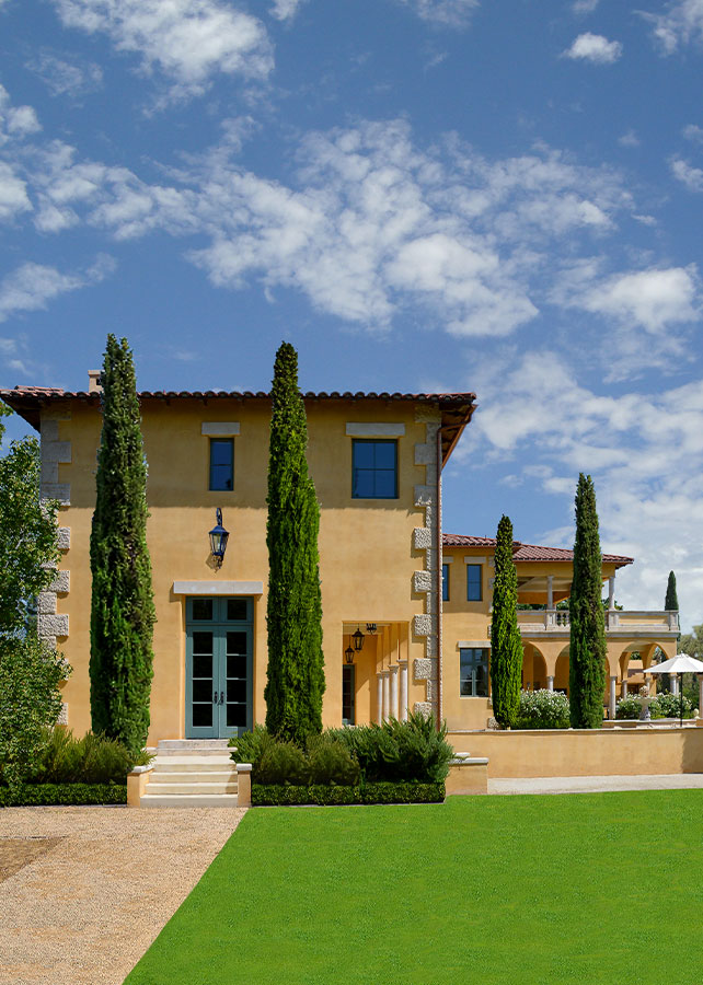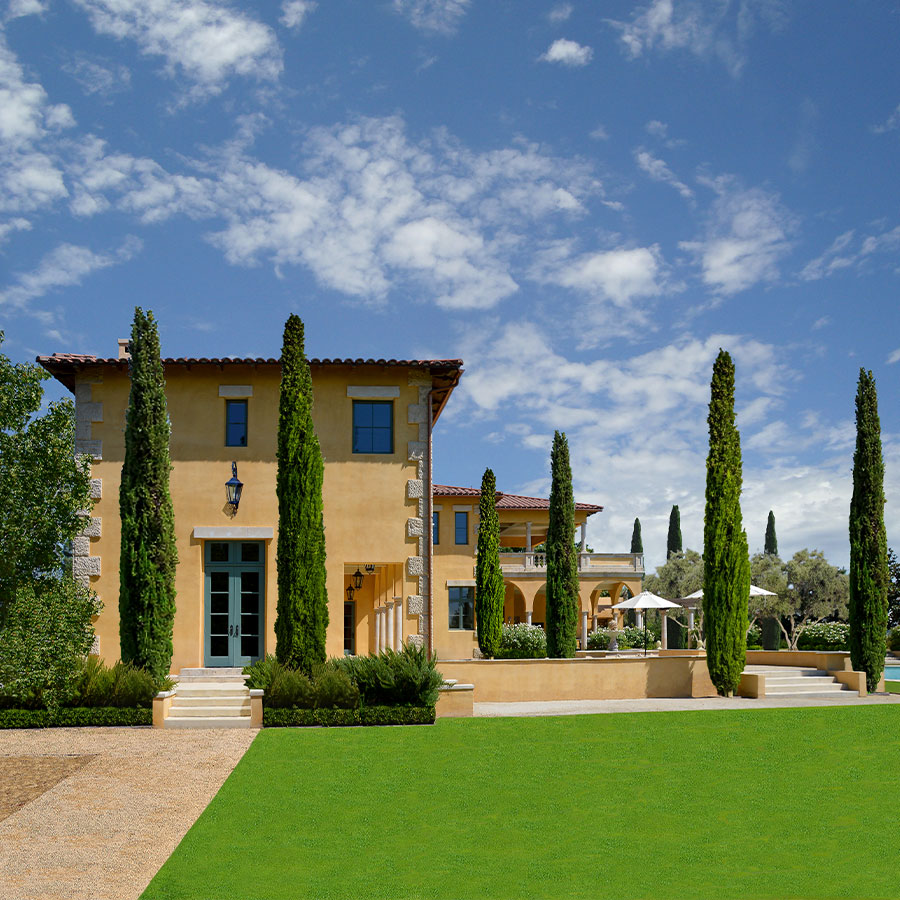 La Toscana is set high on a hill overlooking the rural farmlands of central California with distant mountains as their backdrop. Entering through large stone pilasters and iron Gates, up a long stone driveway and old citrus grove, to a large gravel Motor Court sets the perfect sets the perfect introduction to La Toscana.